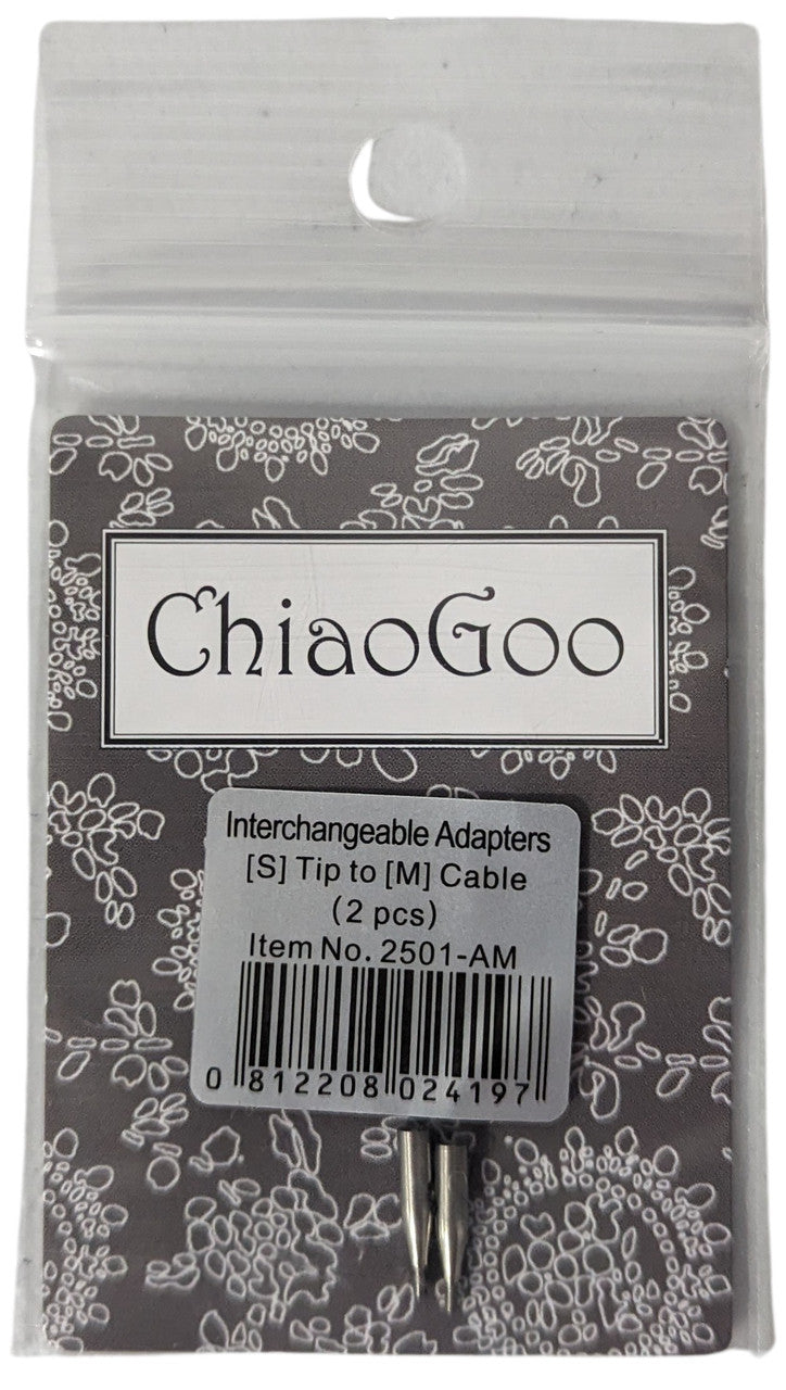 ChiaoGoo Interchangeable Adapters make connecting all of your needles to all of your cables easy! Simply twist one end of an adapter to the correctly sized ChiaoGoo Twist Red Cable and the other end to the correctly sized ChiaoGoo Twist Lace Tip to join the tip and cable together.