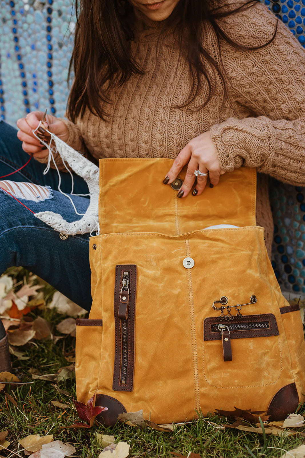 The new Della Q Maker's Midi Backpack is not too small and not too big, striking the perfect balance. A great unisex backpack for traveling and crafting on the go, our Maker’s Midi has been designed to be the ultimate carryall with crafting specific features including a yarn feeder, yarn cutter, and three included emergency stitch markers on a decorative yet functional exterior pin.