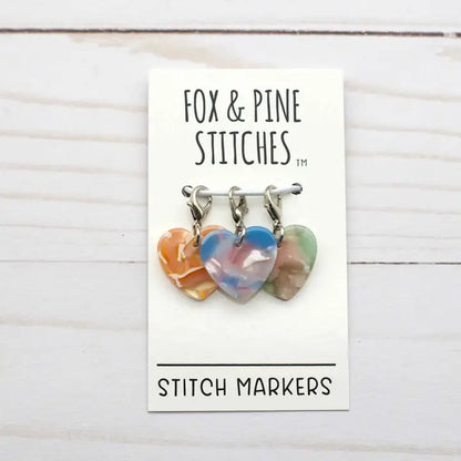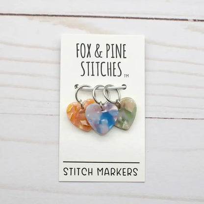 This listing is for a set of 3 heart stitch markers. It includes one heart in each of the 3 colors shown. Pattern placement and colors may vary slightly from the sets shown as each one is unique.