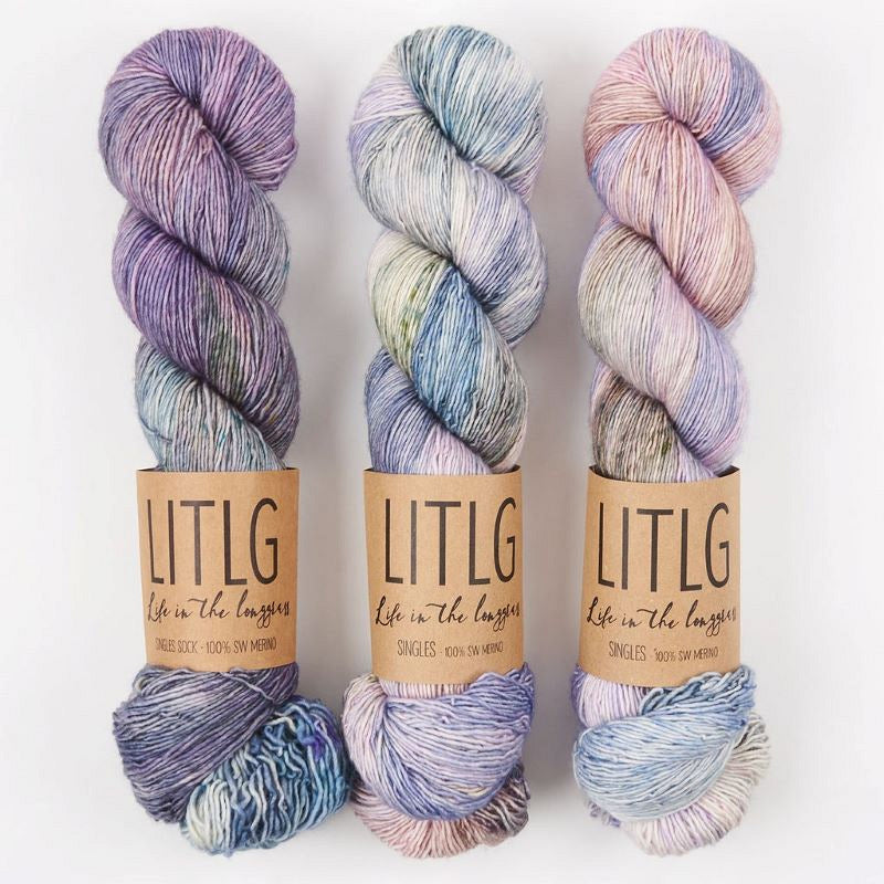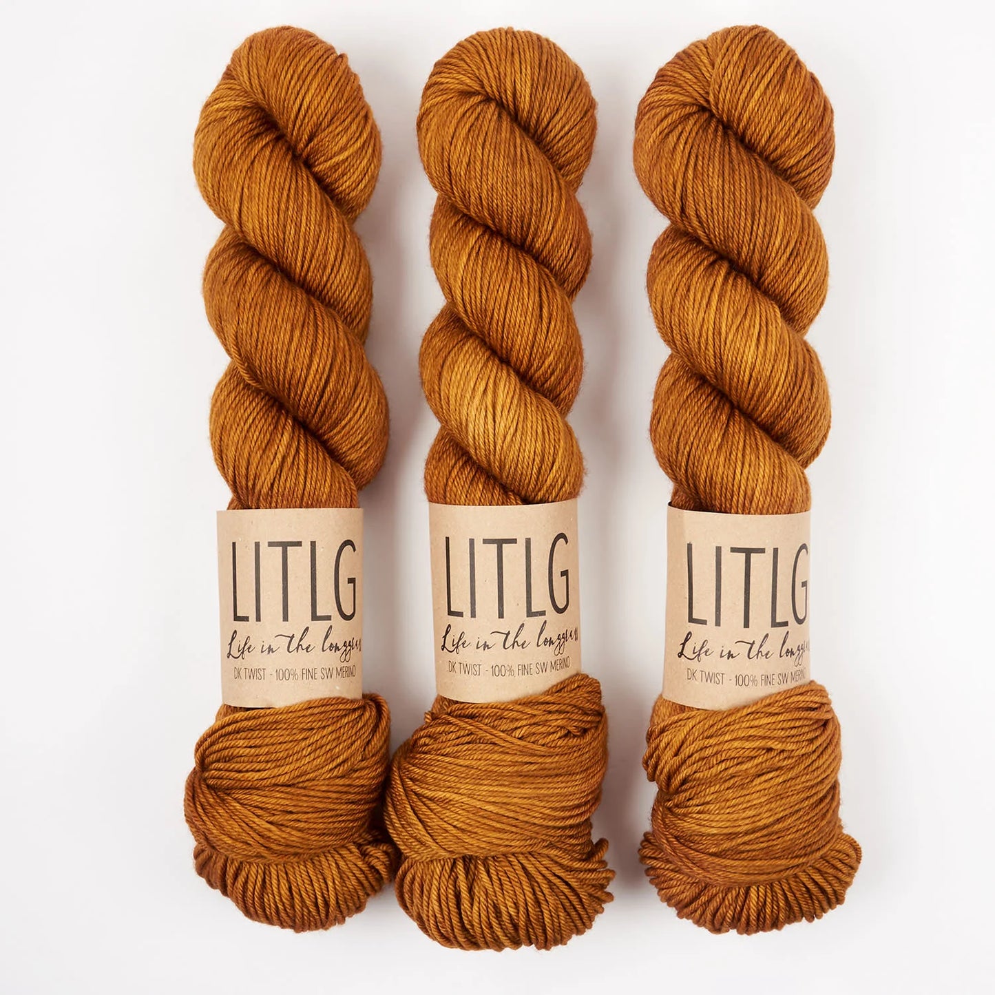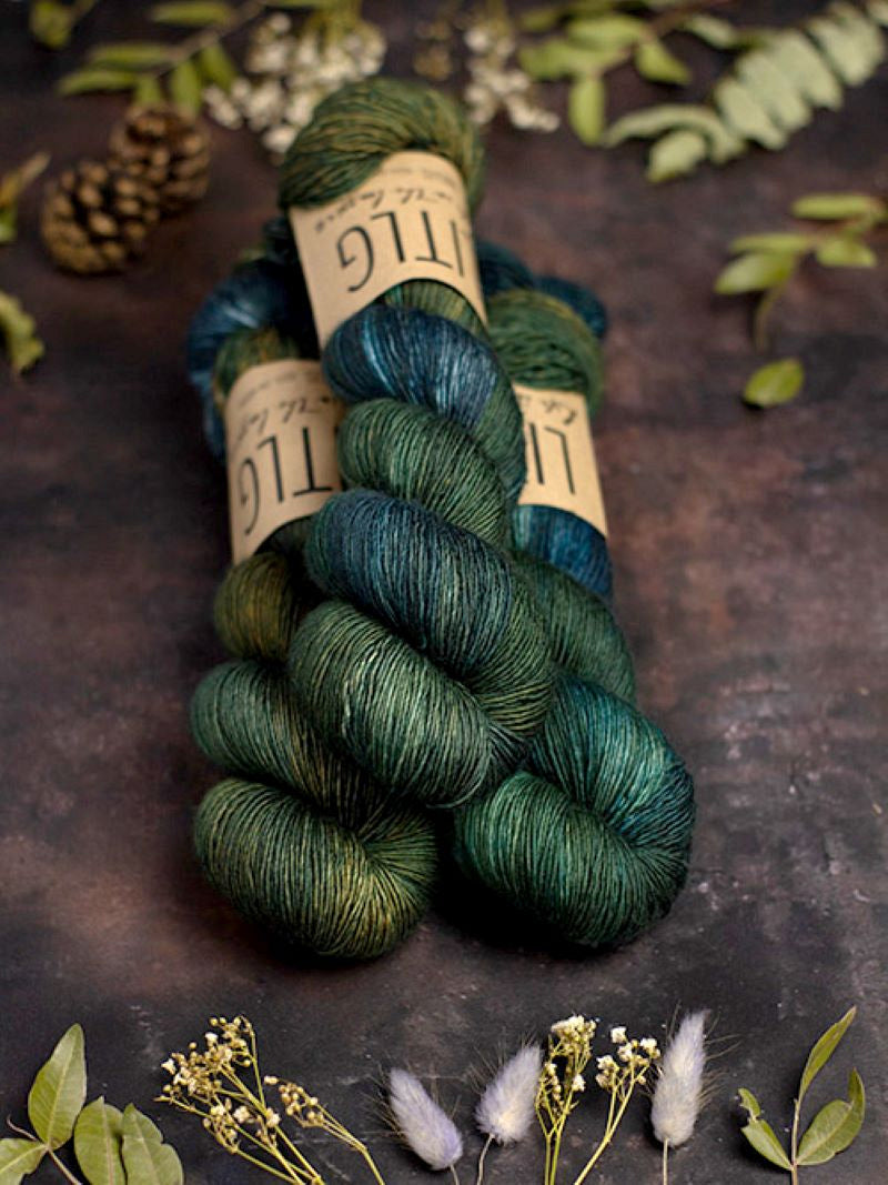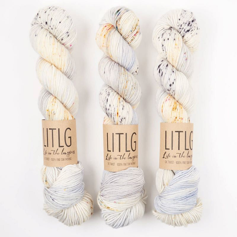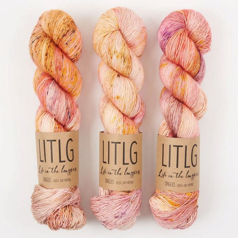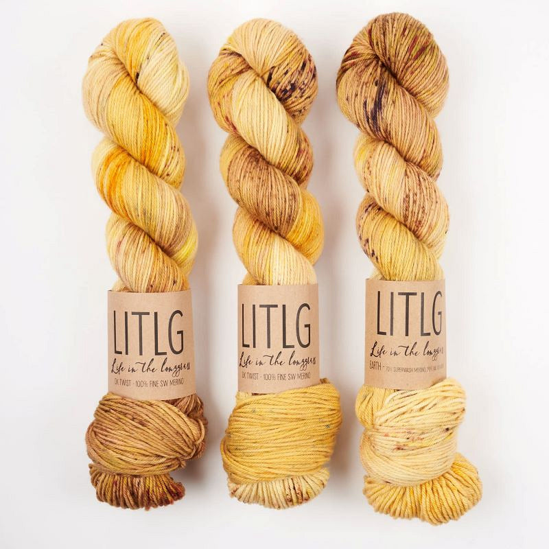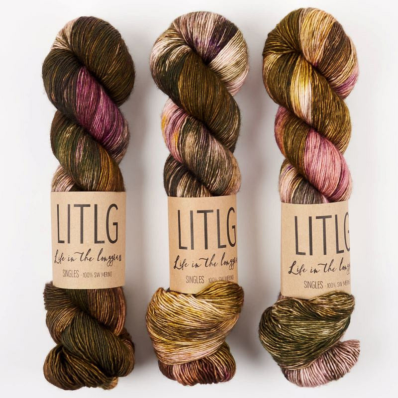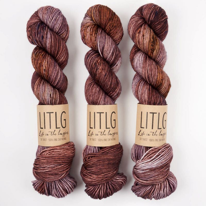 Twist DK from Life in the Long Grass, a heavier yarn weight similar to worsted weight -- a sturdy, structural yarn with good stitch definition and lots of smooth softness. The hand-dyed colors make every single skein