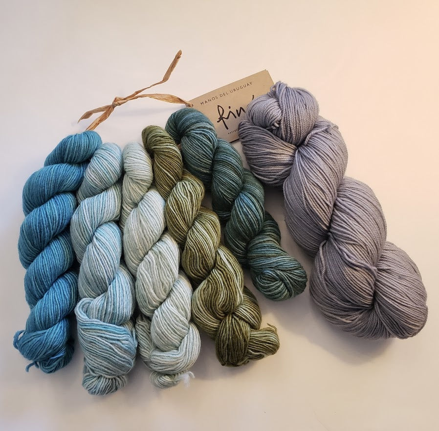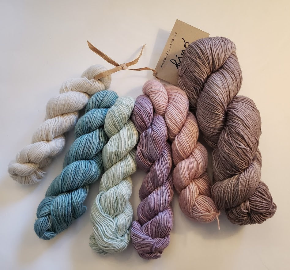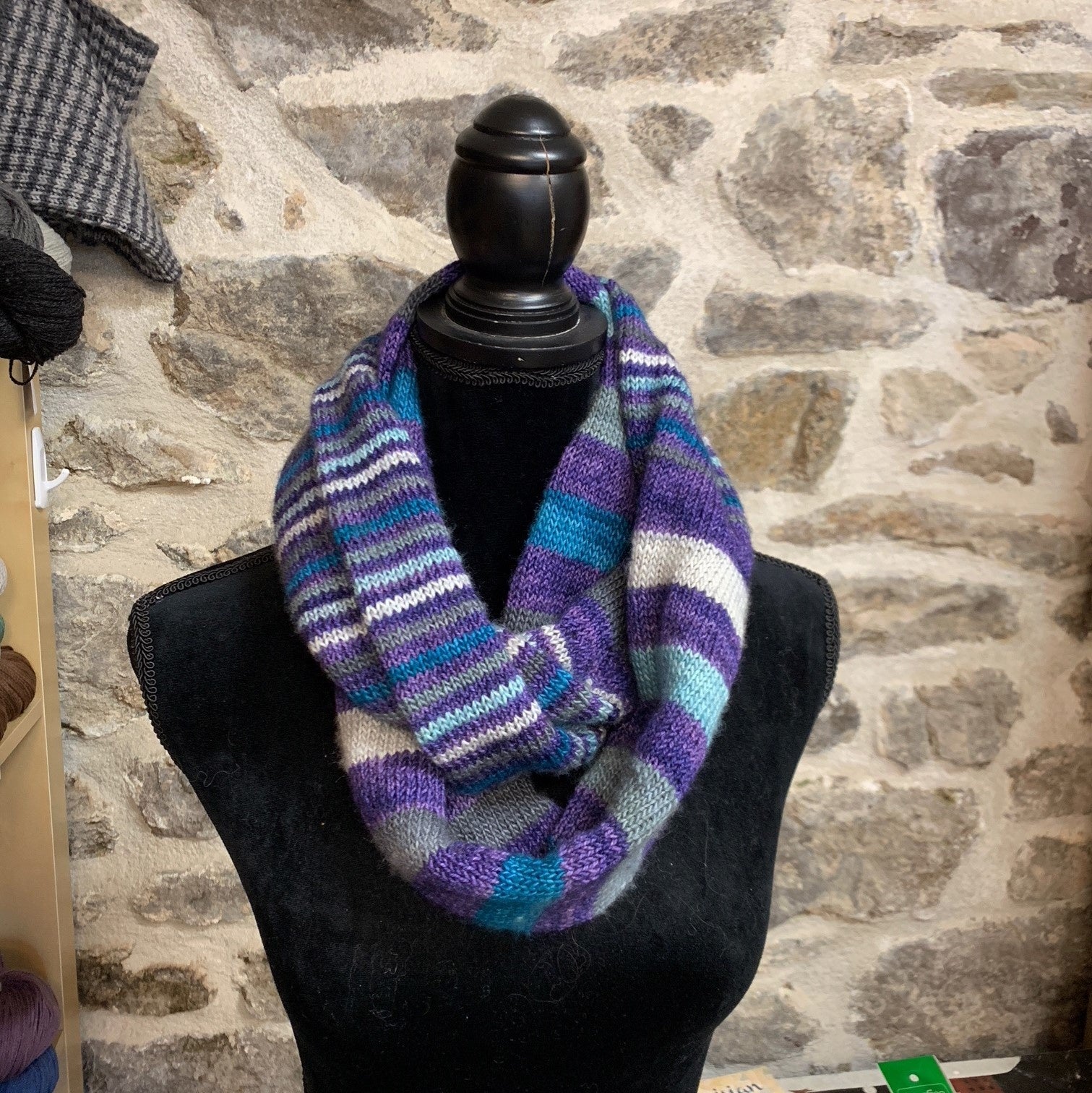 A beautiful cowl knit in the round to create a tube with multiple colors for fun and pretty stripes. An easy pattern with a stunning result. Kit includes enough yarn to make the cowl and the pattern.